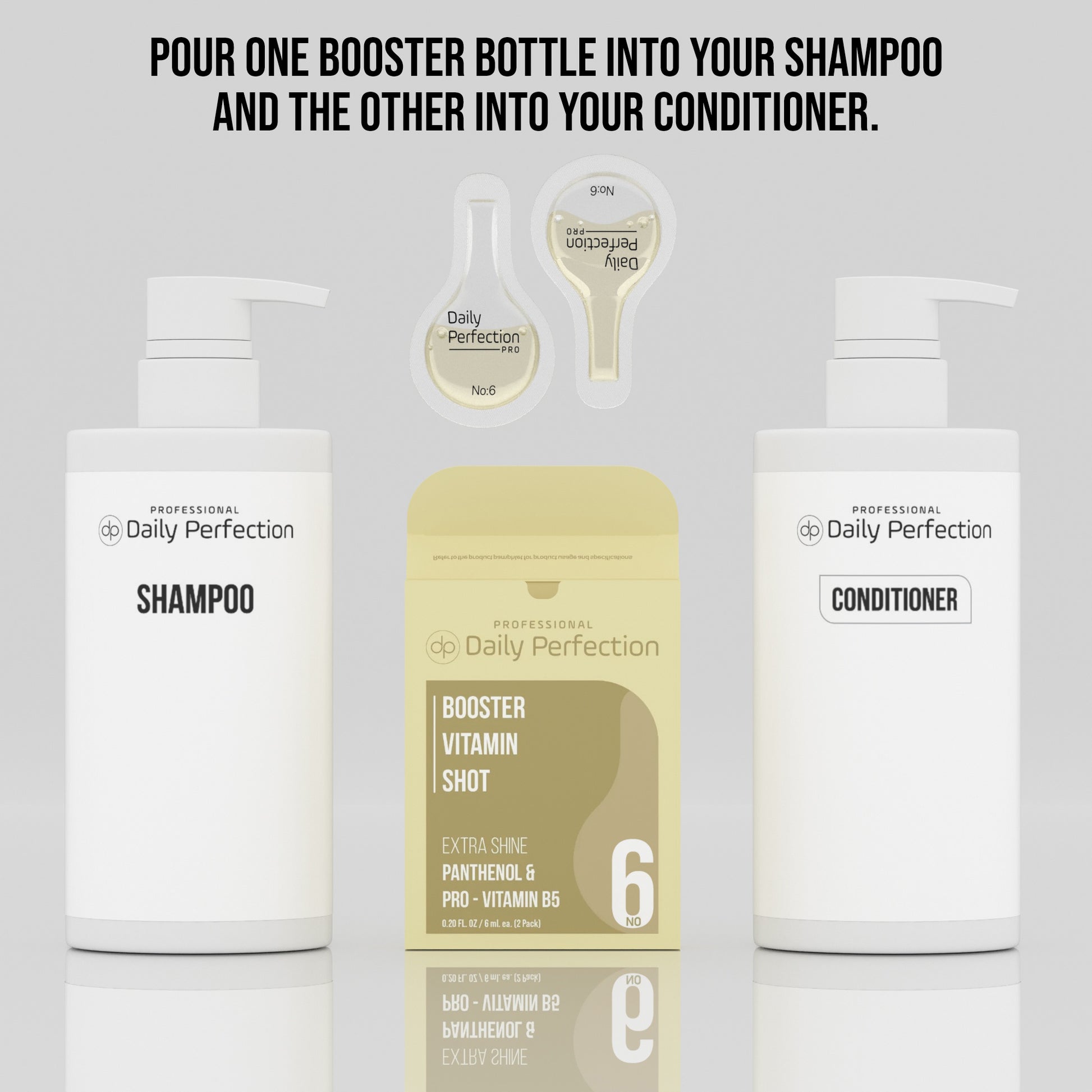 Personalize your hair care with Professional Daily Perfection Extra Shine Vitamin Booster Shot with Panthenol and Pro-Vitamin B5. Specifically designed to add more shine to dull hair.