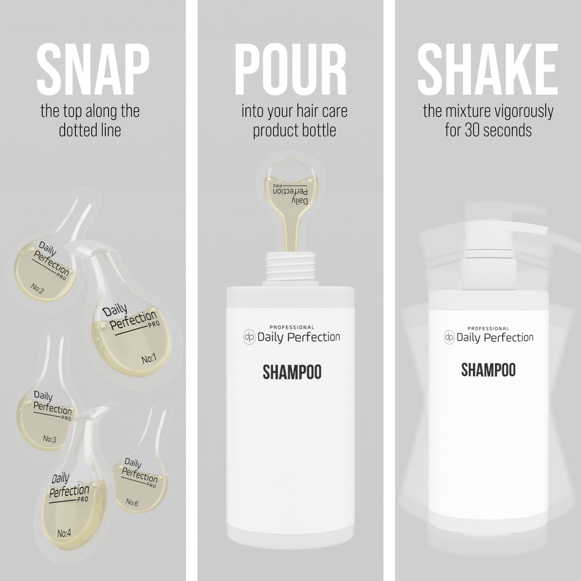 Choose a Daily Perfection shampoo or conditioner as your base. You can select up to three distinct booster shots to target your unique hair care needs but use only one shot of each type. Pour one booster bottle into your shampoo and the other into your conditioner.